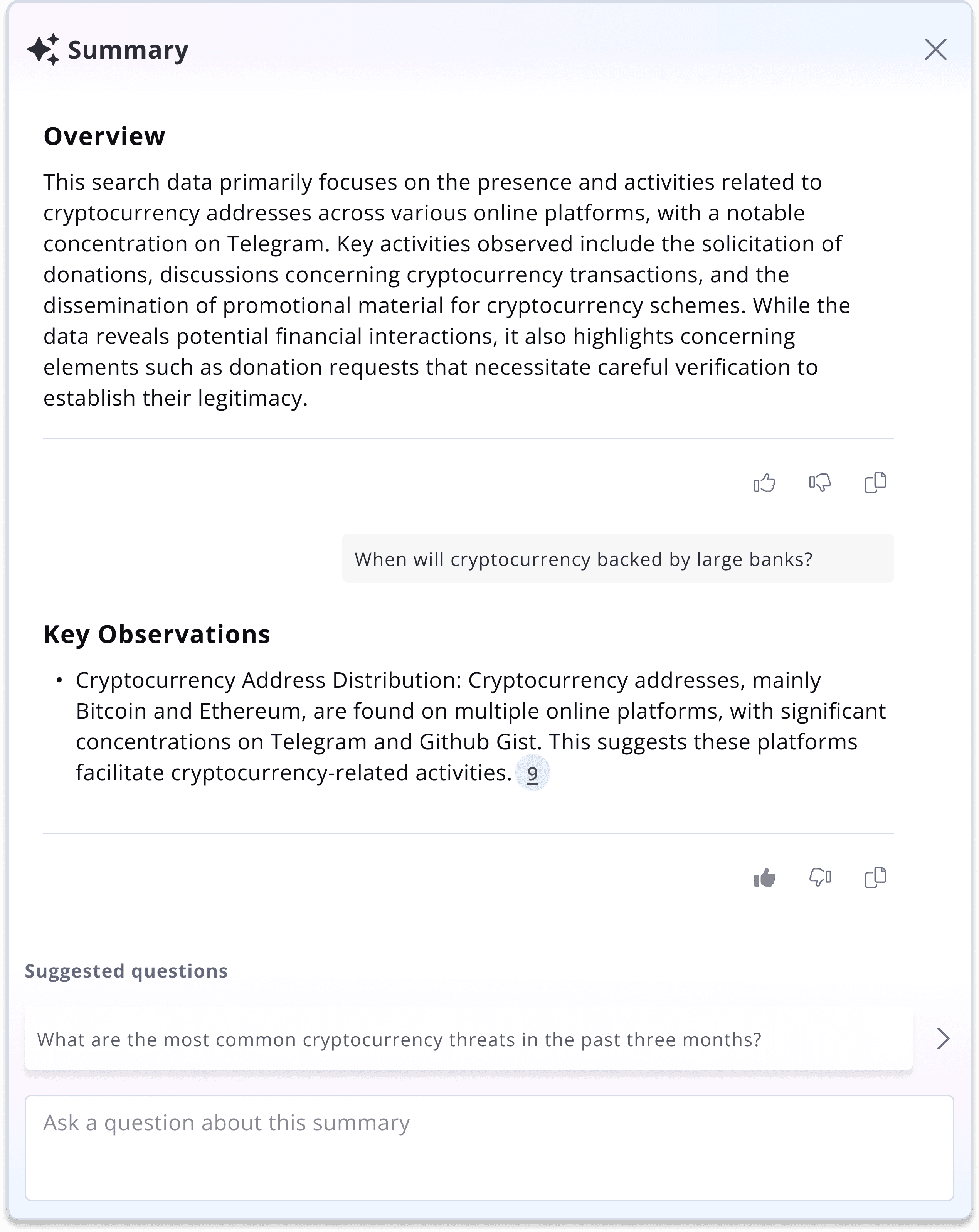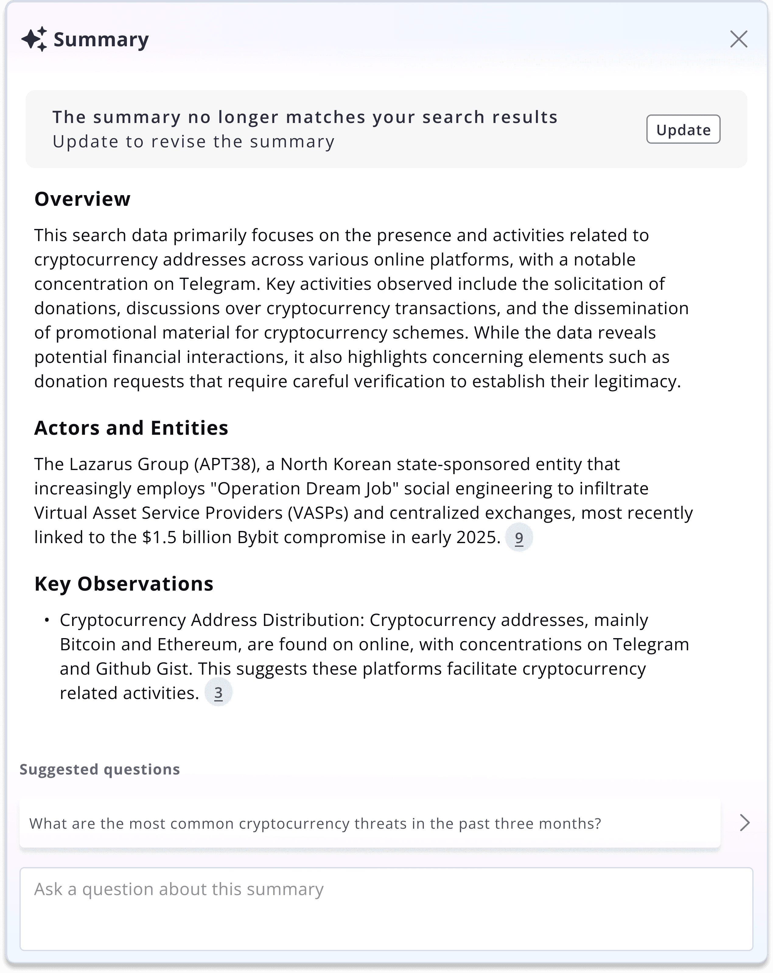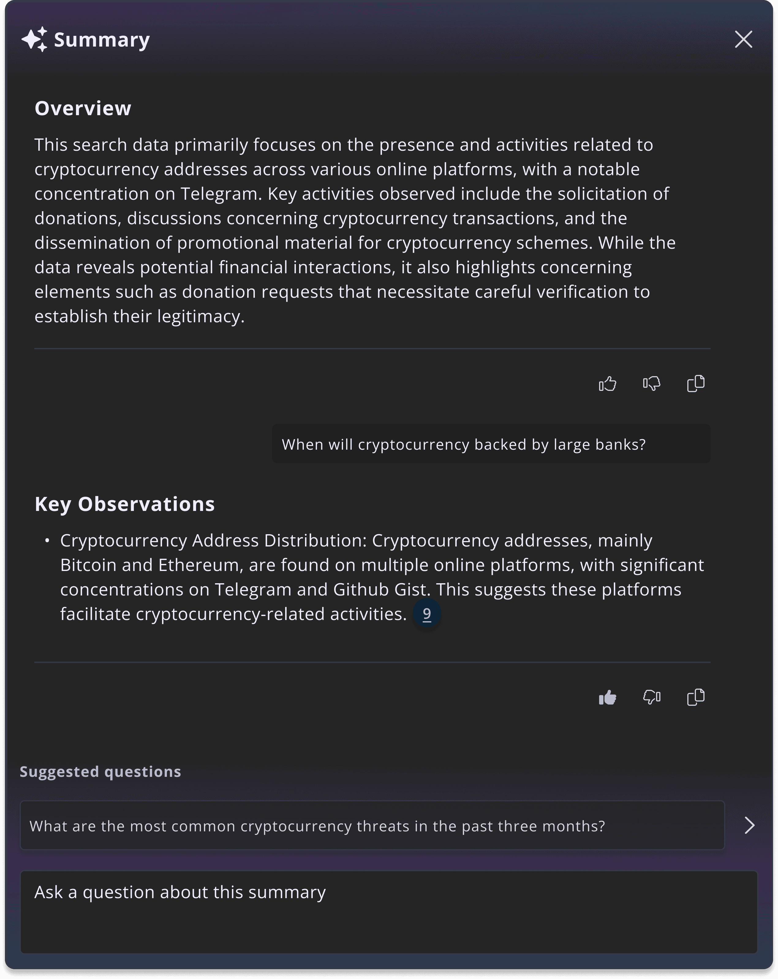 Persistent Workspace Control: A collapsible panel allows analysts to minimize the AI summary at any time, reclaiming screen real estate for deep-data triage while keeping insights just one click away.