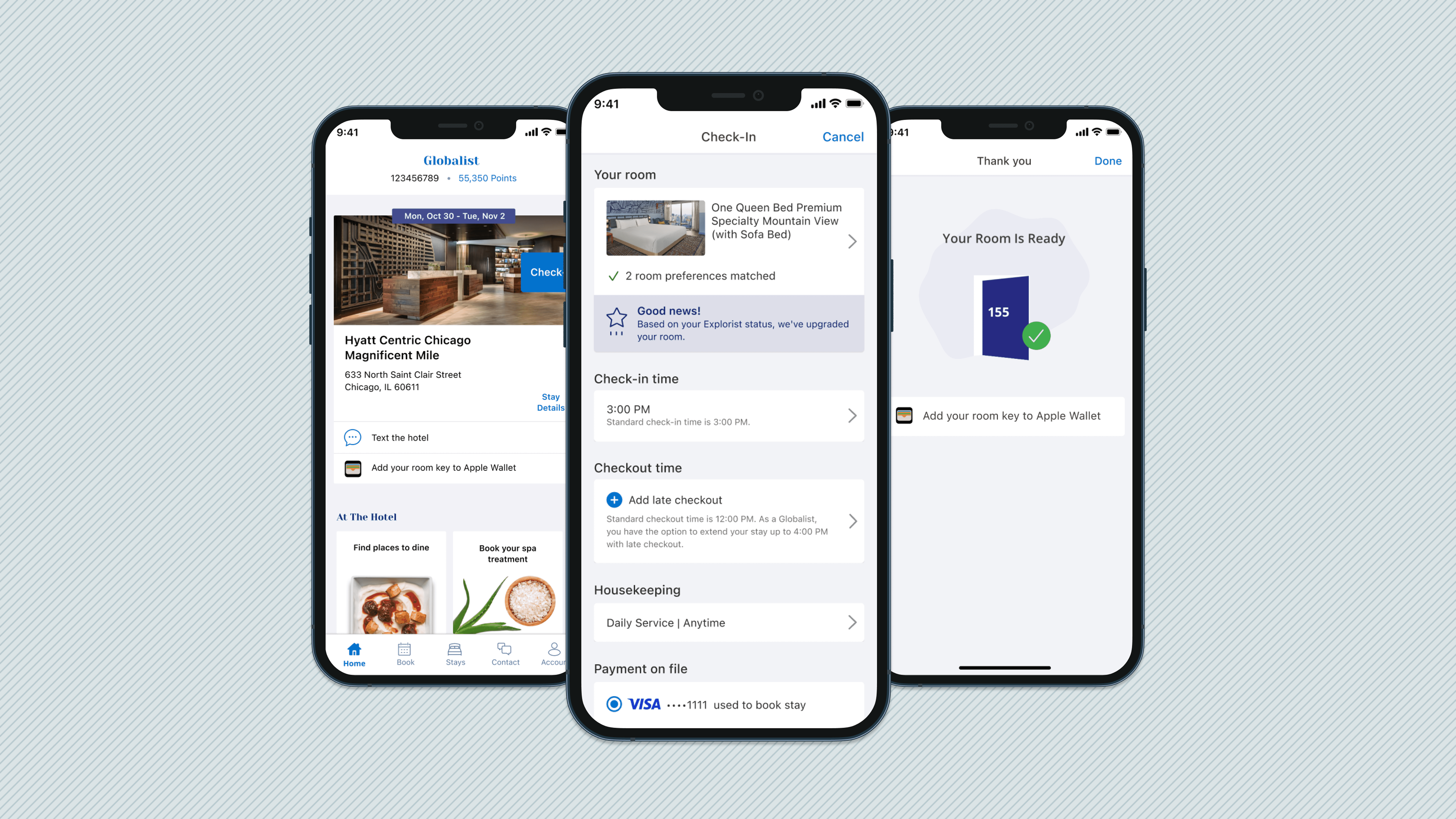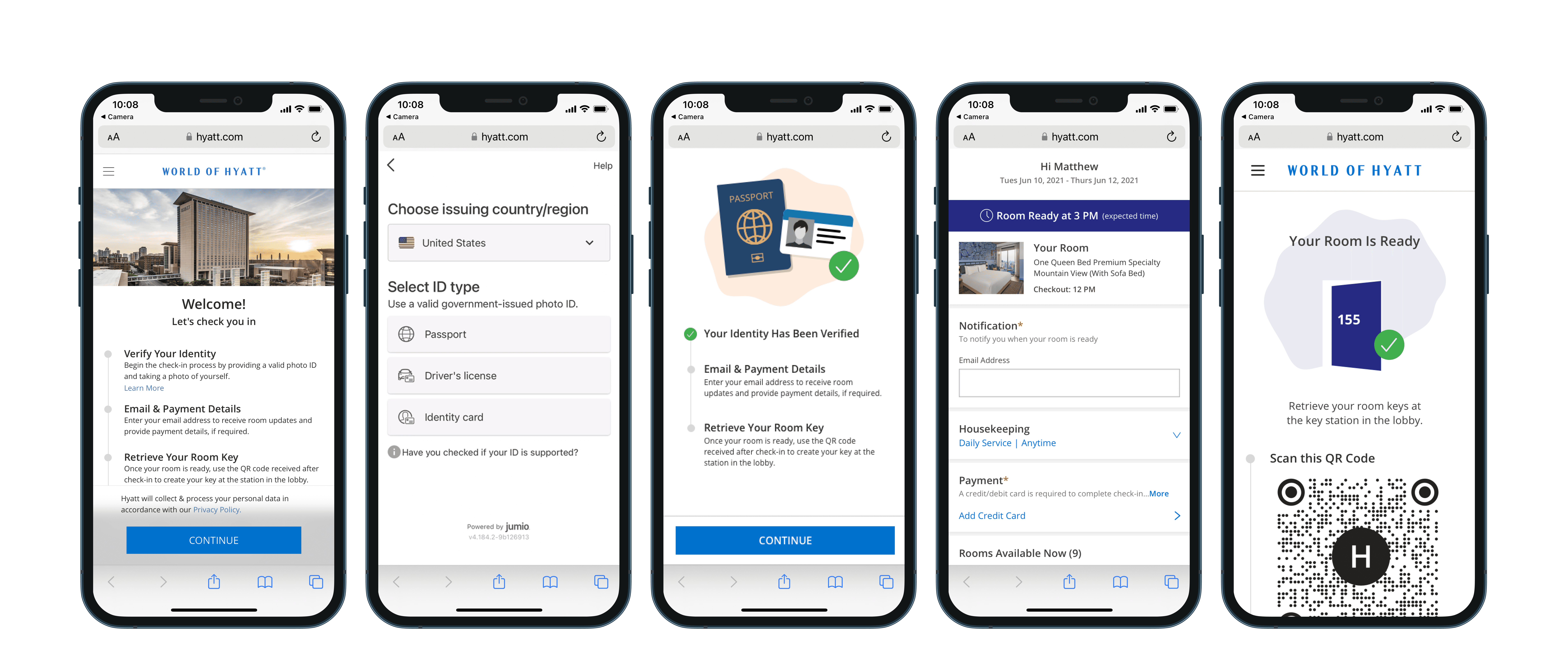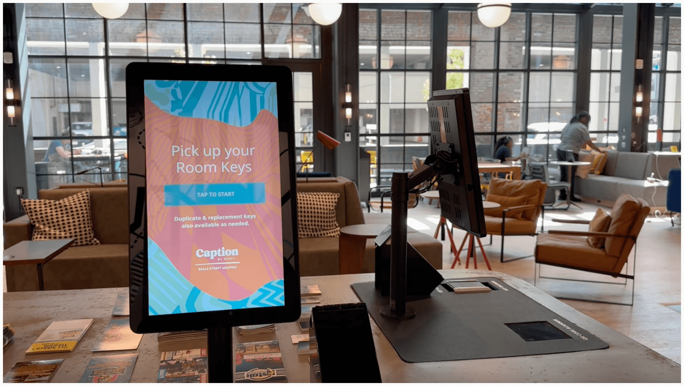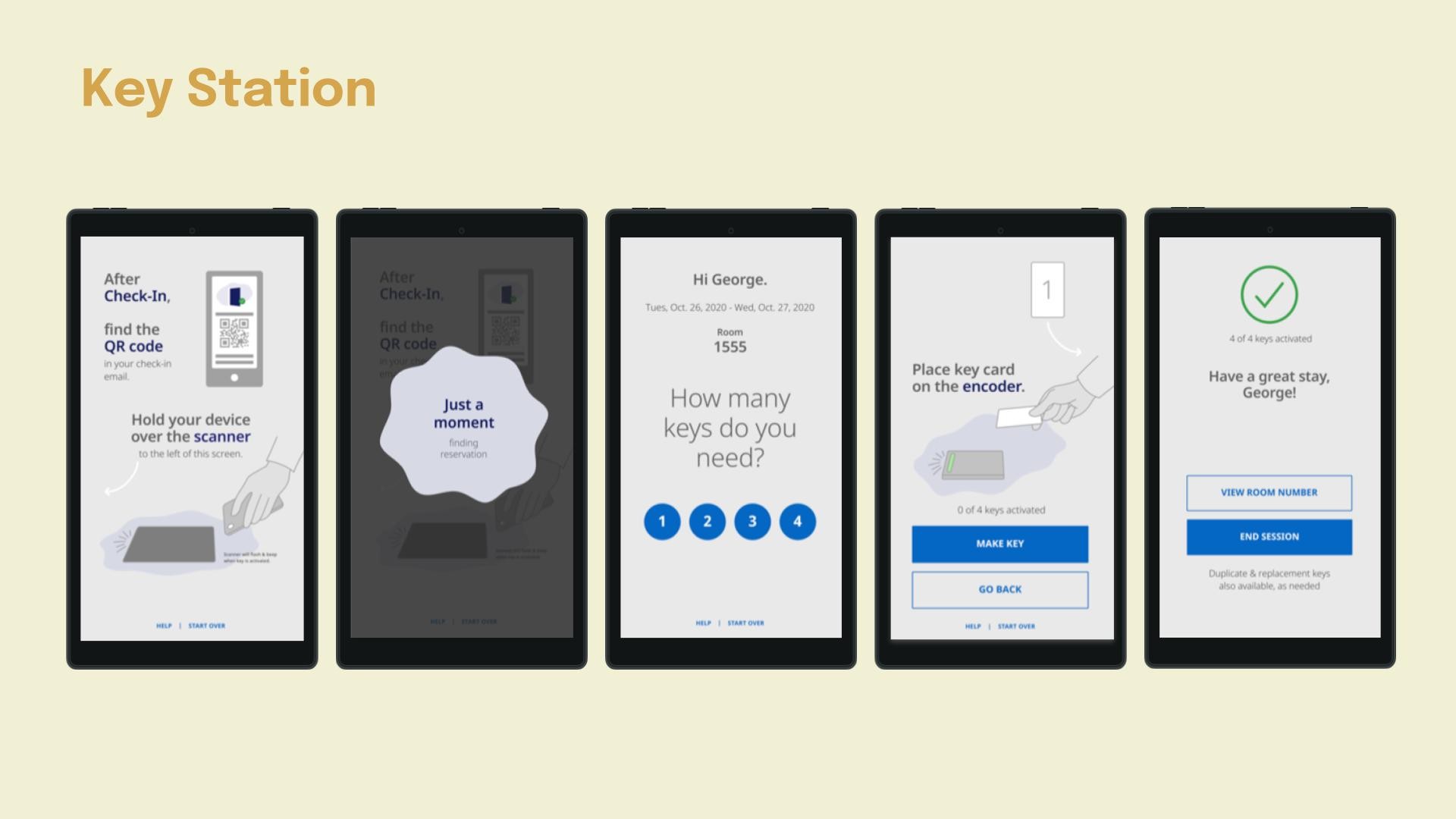 This scan immediately launches a dedicated web-based check-in flow, starting with a Welcome screen that allows guests to initiate self-service without requiring a direct Hyatt booking or app download.Key Station