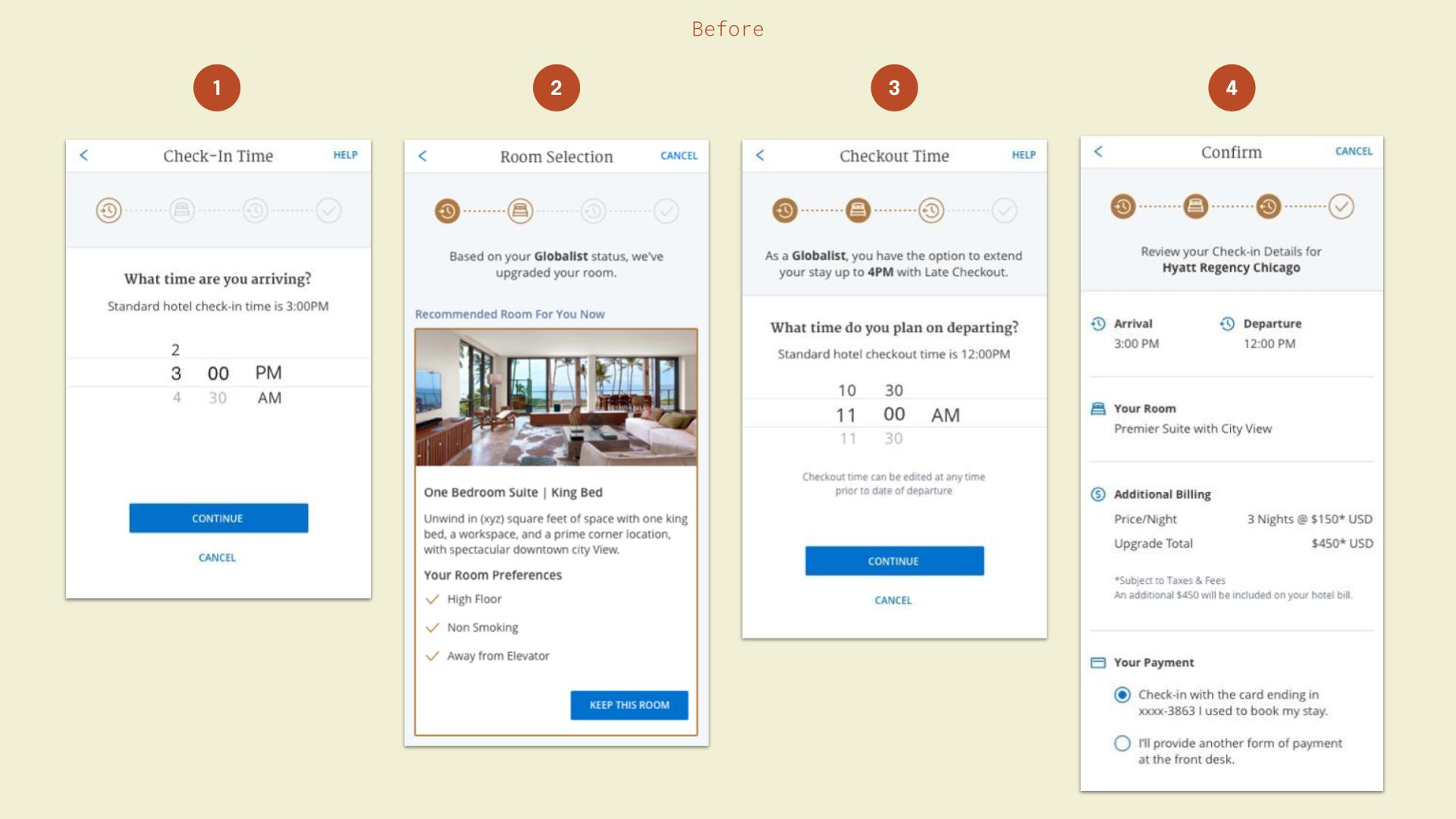 The existing digital check-in was constrained by its 4-page structure and required a minimum of 4 clicks. This structure was not scalable; adding new features, such as housekeeping requests, would require expanding the required page count.