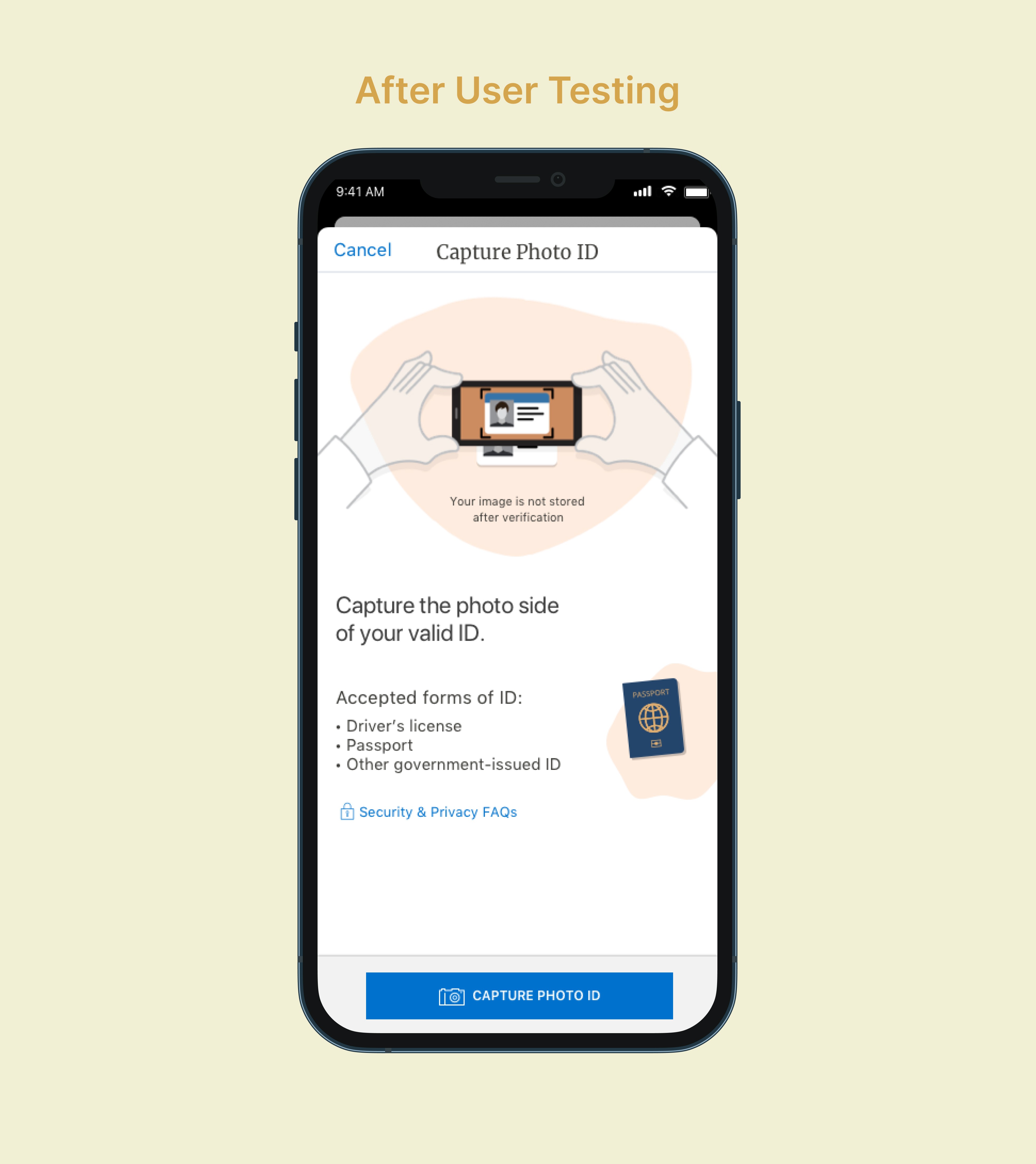 Improved the visual design by clearly displaying accepted ID types, making the flow more engaging, and swapping the background for an easily adjustable vector image.