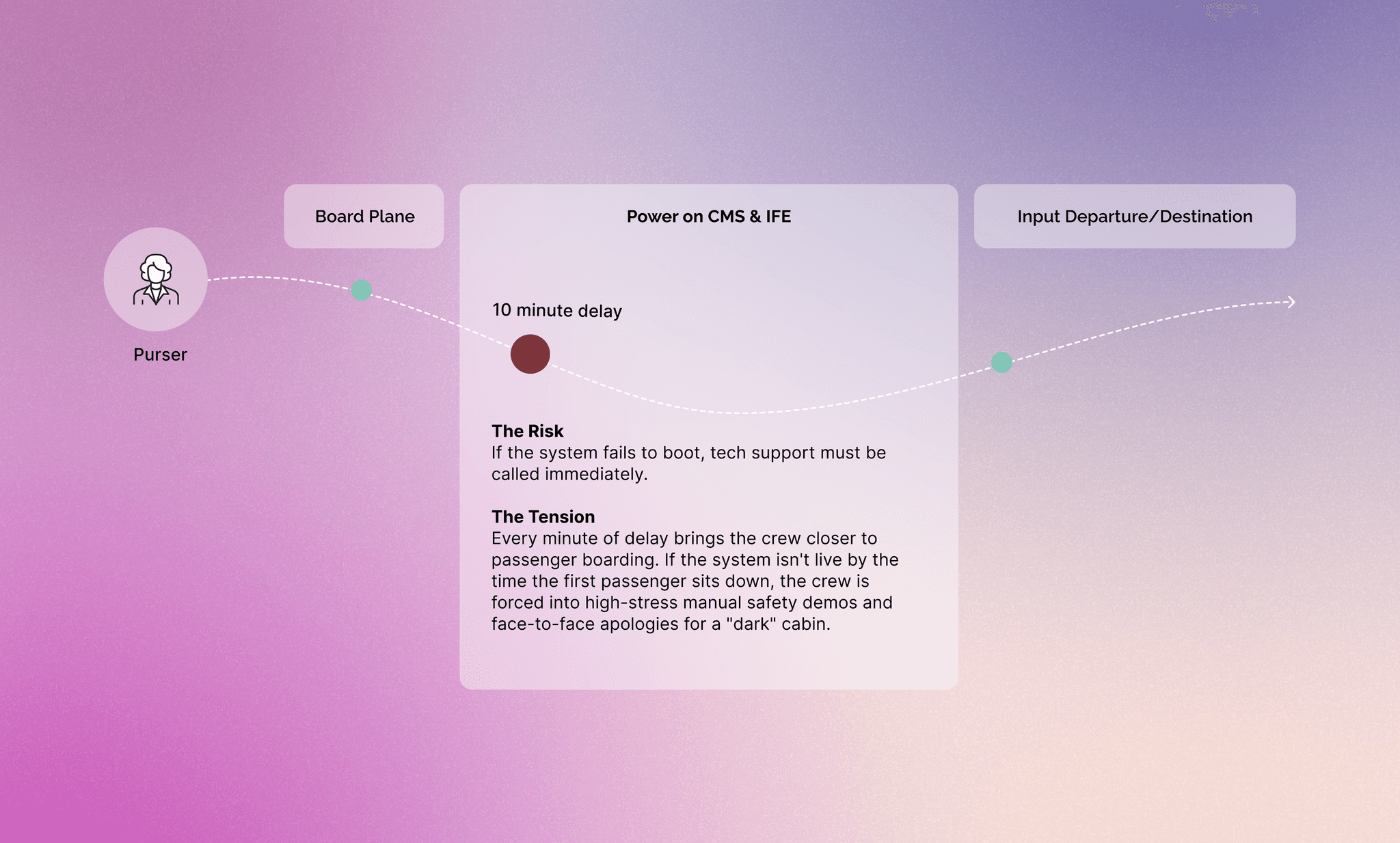 System Latency & Anxiety: Legacy systems take 10+ minutes to boot. If the system isn't ready by boarding, FAs are forced to perform manual safety demos, adding stress to the departure timeline.